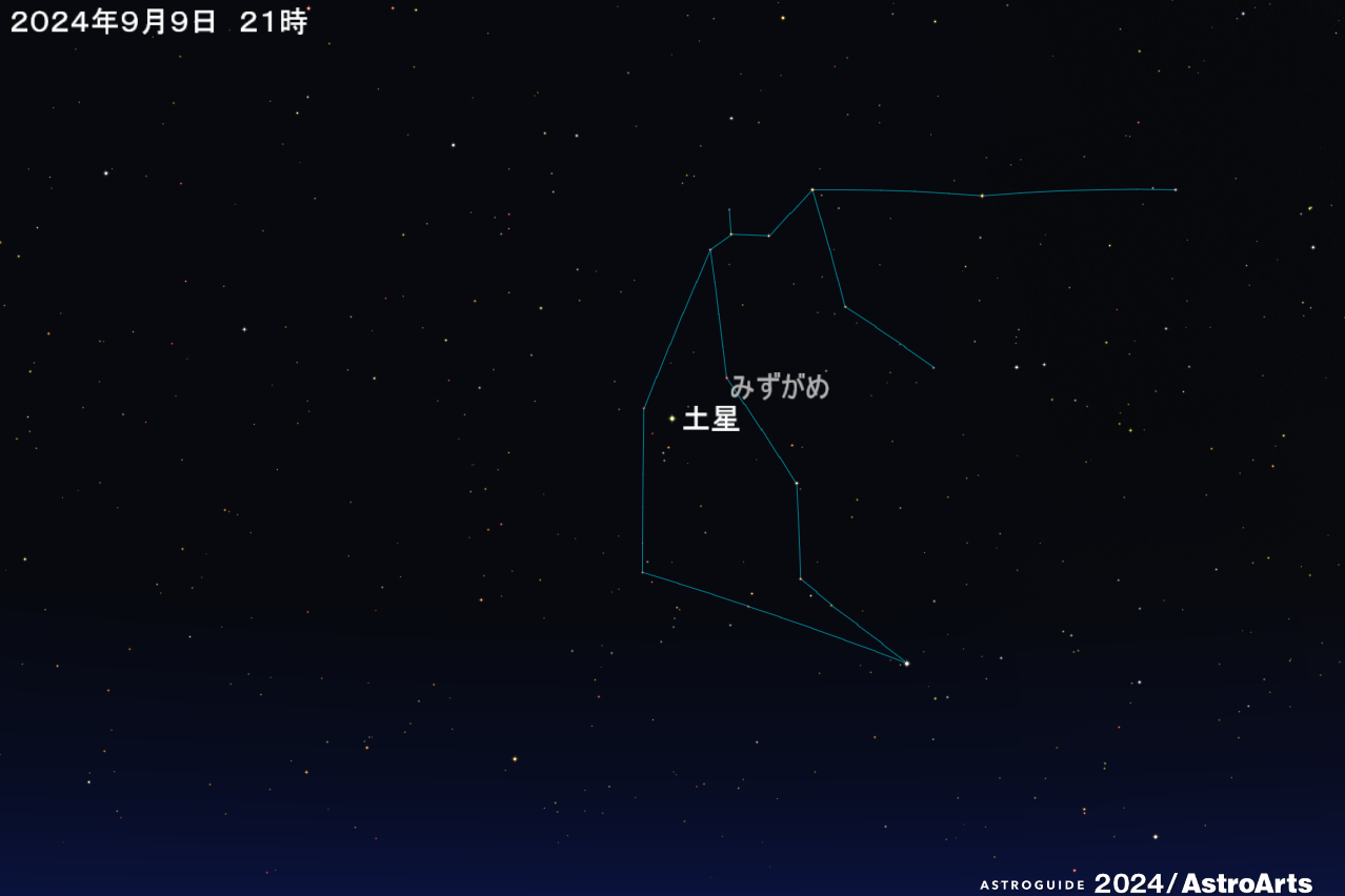 アストロアーツさんからお借りしました。これは午後9時あたりの土星の位置。。。これから18時間前の9日になってすぐの夜中の3時では、土星はオリオン座のベテルギウスの左上に位置していました。
