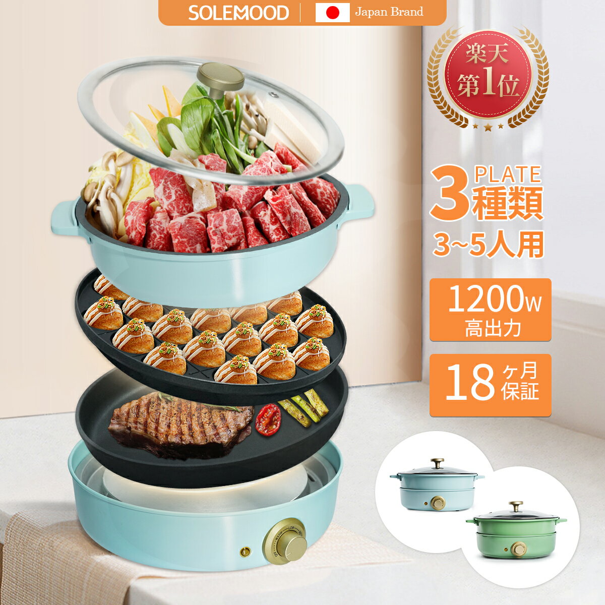【1,000円クーポン配布中 8/21迄】ホットプレート 3種プレート 鍋 焼肉 電気 大型 深型 マルチ グリルポット たこ焼き器 深鍋 煮る 焼肉プレート 一人用 焼く 蒸す コンパクト 鉄板焼き器 グリル鍋 おしゃれ かわいい ブルー グリーン 炒め物 SOLEMOOD 楽天市場 ${EVENT_LABEL_01_TEXT}