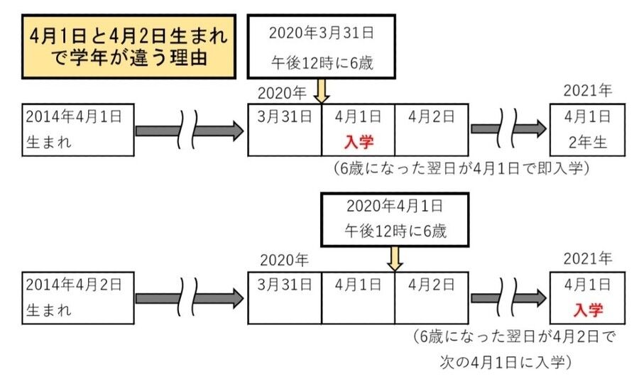 そこで、2014年4月1日が誕生日の人は、2020年4月1日からの学年になり、今春から小学校に通うことになります。それに対して、2014年4月2日が誕生日の人は、2020年4月1日の午後12時に満6歳になりますので、2020年4月1日からの学年にならずに、満6歳になった翌日以降の学年である2021年4月1日からの学年、つまり来春の入学になるのです」