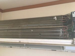 このように熱交換器が茶色く変色してきています。これは錆び始めている状況です。