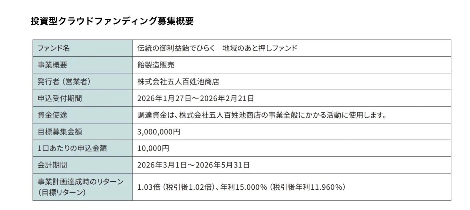 本ファンドの募集期間は2026年1月27日から2月21日まで。目標募集金額は300万円、1口あたりの申込金額は1万円に設定されている。事業計画達成時の目標リターンは1.03倍(税引後1.02倍)、年利換算で15%を見込んでいる。