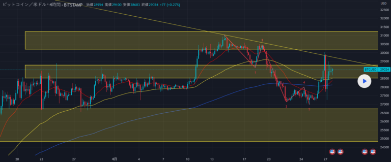 逆三尊を意識して$28515~29270で売りを検討するのもありですが、上述したようにいくつかの指標に対してはニュートラルであり、債務上限引き上げが合意に至らなかった場合ゴールドの上昇に連れてビットコインも上昇する可能性が高いのでリスクは高めとなるのではないでしょうか。