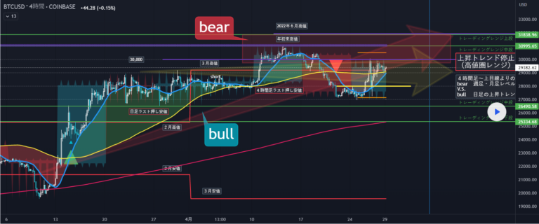 ・3月までは上昇トレンドであったが、4月に入り4時間足レベルとしては上昇トレンド停止