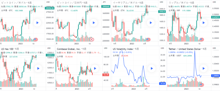 現在、ビットコイン(BTCUSD)、ビットコイン(BTCJPY)、イーサリアム(ETHUSD)、リップル(XRPUSD)、ナスダック(NAS100)、コインベース(COIN)、恐怖指数(VIX)、テザー(USDTUSD)の8つのチャートを同時に表示させています。