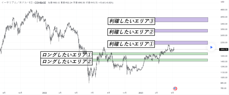 イーサリアムが落ちた場合に狙いたいところをチャートに記載しました。