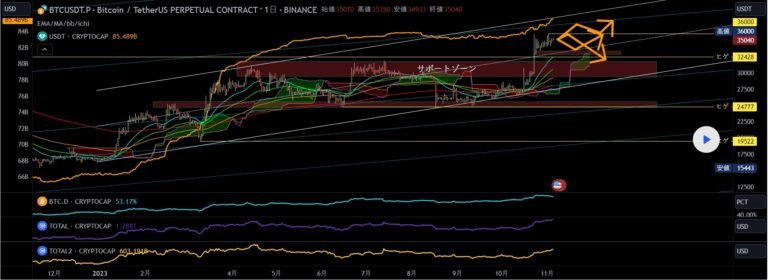 テザーの流通量も10月中旬から上昇しており(オレンジ色チャート)気になるポイント。