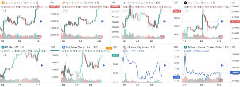 現在、ビットコイン(BTCUSD)、ビットコイン(BTCJPY)、イーサリアム(ETHUSD)、リップル(XRPUSD)、ナスダック(NAS100)、コインベース(COIN)、恐怖指数(VIX)、テザー(USDTUSD)の8つのチャートを同時に表示させています。