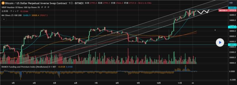 下落しても下落が続かないのはデリバティブ主導のものと考えられ、資金調達率も現れている。現物主導の下落が来ない限りはじわじわと上昇が続くと思われる。