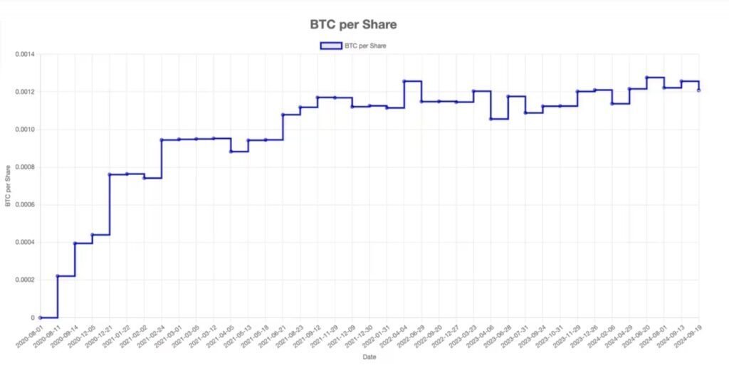 MSTR-trackerによると、マイクロストラテジーの1株あたりのビットコイン比率は現在、約0.0012。この指標は、長期的な株主がビットコインの保有により価値の増加を経験していることを示唆する。