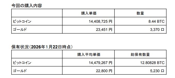 今回の追加購入により、同社の総保有数量は、ビットコインが12.80828BTC、ゴールドが5230口に達した。