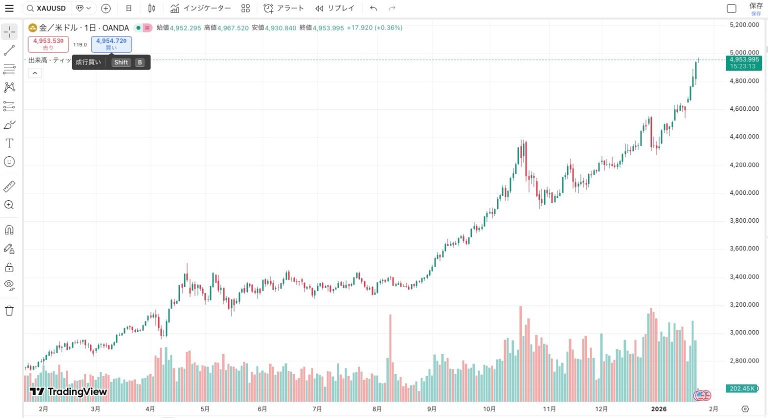 現在、ゴールドの相場は1オンス=4900ドルを超えて連日で過去最高値を更新しており、年初来の上昇率は15%に迫る勢いを見せている。