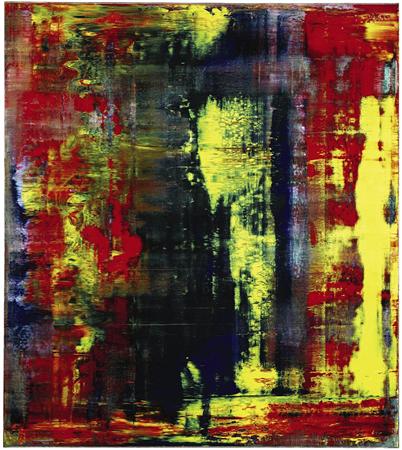 この絵は「アプストラクテス・ビルト(809-4)」とのタイトルで、赤、黒、黄色などで描かれた油絵。 1994年に制作された。美術品収集家でもある英ロックギタリスト、エリック・クラプトンさんが所蔵品から出品した。