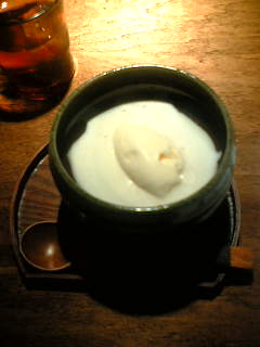 窓際はさすがに日が入るから、そんなことはないのだが、壁側はすべて間接照明であるから、すぐ近くに座っている人の顔もいまいち判別できない。そうすると間仕切りを作らなくても、プライベートな感覚が実現できるわけだ。ゆえに、否応なく落ち着いてしまうのである。さて、運ばれてきたお汁粉は、予想通りやさしい甘さで、じっくりと舌になじみ、そして、体が心持ほっこりあったかくなるおいしさである。あったかいお汁粉の上にアイスクリームが乗っているのだが、これがまたいいバランスで非常においしい。病み付きになること請け合いであり、思い切りがーっとかきこんで「おかわり!」と言いたい気分にさせられた。