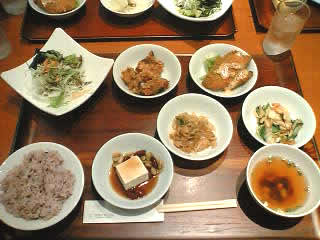 ユニークなのが「お孫さまランチ」。要するに「お子様ランチ」なんですが、年配の方が多いんでしょうか?それとも3世代でいらっしゃる健康家族が多いんでしょうか?これをオーダーすると、落ち着き無く、ソファ席を上り下りしてる幼児が孫に見えてくるから不思議です(笑)んな、わけないか・・・。うちの奥さんも「ここなら外食につきものの罪悪感がないわ!」と喜びつつ、僕に「ねえ、この血液さらさらコースとかいいんじゃない?」と勧めてきます。ほかにも“健康欲”を刺激するコースがあって・・・うーん、うーん、と優柔不断度が爆発しております。結局は3品あるいは4品を選べるランチコースにしました(写真)。ごはんや味噌汁、サラダは付いてきます。味もそこそこ付いてて足りないほどではなく、量は少なめでほんと腹八分目という理想のメニューでしょうか・・・。でも、足りないんだなあ・・・足りないんだな・・・「すいませーん、胡麻団子一皿くださーい」と追加。これがとても美味しいのです。ところが、嬉しそうに頬張ってたら、「ミズチも、それ、食べたいな~」と言いだしたガキに全部、盗られました・・・。ちょっと健康にこだわりたくなったら、また出かけそうです。