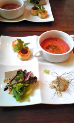 晴れ間の間に青々とした緑の森に囲まれたログハウスのようなレストランは、その光と緑と茶色のコントラストを見事に輝かせて我々を迎えてくれていた。迷うことなく建物を一周する。水気を十分に吸って生き生きしている草木を眺めながら、その空気を深呼吸してみた。「いいねえ、こんなところに住みたいねえ」と、最近の我々夫婦の常套句を交わし、木々の向こうを流れる川音に耳を澄ませ、木洩れ日に目を細めてみた。体も心も芯から喜んでいるのよく分かる。そうして、ここを訪れる人の多くがするであろう、そんな下ごしらえ済ませてから、いよいよレストランの中に足を踏み入れた。実はこの日、朝晴れ渡った空を見て、どこか緑の美しい場所でランチを食べたいと、このキッチンスヌーグを思い立ったのであった。相変わらず思いつきの日々ではあるが、予約が簡単に取れたのは至極幸運だったと言わざるを得ない。