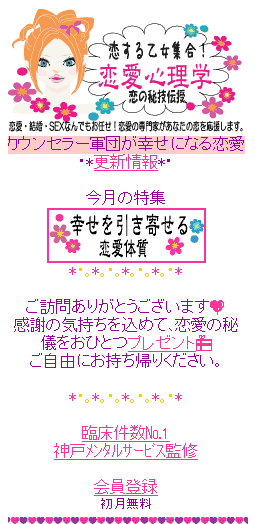 これは僕が担当した「恋愛能力テスト」のほんの一部。このような問題を、ずらーっと31問、ご用意させていただきました。僕のお客さまリスト&お友達リストから、“恋の達人”“恋愛上手”“モテ女”“魔性の女”“男の敵!”といった女性達を抽出し、「あの方は何て答えるかな?」「あいつなら、どうするだろう?」「あの人なら、問答無用にコレだな」などと想像力を駆使し、それでも自信が無い問題には「あの・・・、あなた様ならば、この問いにどう答えるでしょうか?」と丁重にお聞きし、作成した31問の心理テスト。中には「あたしならば、そんな男、すぐに切るわ」という設問にならない答えをもらった場合もありましたが、何とか完成させることができました。ジャンル別にあなたの「恋愛能力」をチェックしてしまいます!時々問題も入れ替わるので(つまり、定期的に僕はこれを作り続けなければいけない使命にあるようです・・・)、時々チェックしてみると自分の恋愛力の浮沈も分かってしまうかも!* * *他にもカウンセリングサービスや母体の神戸メンタルサービスから強力なカウンセラーが参戦して、あなたの恋を全面的にサポートします。一番やる気になっていた社長の平は「恋メールde恋ガール」と「恋愛フィットネス」を担当。彼のハートを鷲づかみにするメールテクニックや、恋愛能力アップのためのシミュレーションゲームのシナリオを担当。本人は未だにメールを打てないのに、ハッと驚くメールテクを数々ご紹介。また、切れ者の北端&原コンビは「Girlsチェック」「Boysチェック」にて、私と彼の恋愛パターンや傾向と対策、そして、相性診断を作成。まさにドキッとさせるネタを用意してくれてます。また、テレビチャンピオン兼夫婦漫才カウンセラーの中原は、「チャンピオンの部屋」として、恋の指南塾を開講。きっといつもの名調子で、笑わせながら、楽しませながら、ネタの数々を疲労しながら、なるほど!な講座を見せてくれるはず。そして、悪女代表の村本は本丸である「小悪魔テク」を担当。「小」を「こ」と読むのか「ど」と読むのかは未だに僕にはワカラナイのですが、「アタシはふつうにやればいいんですよね?」と不敵な笑みをこぼしており、僕もその中身が非常に楽しみです。***他にも、我々がほんとうにほんとうに涙しながら徹夜で作った「今日のハート」では、簡単な心理テストで「今日の恋力」「幸運力」「心バランス」を日替わりの問題でチェック。例えば、Q今日のランチはどんなところで食べましょうか?A.ちょっとオシャレなカフェB.穴場の美味しいお店でC.職場近くの定食屋で軽く済ますD.コンビニ弁当にE.手弁当を会社の会議室で。といった簡単なチェックシートから、あなたの今日の恋力をチェックしちゃったりします。#まことに申し訳ありませんが、どれもサイトにて公開予定の本物のネタのため、回答をご紹介するのは出来かねます。まったくもって予定調和ですいませんが、ぜひとも、ドコモのi-mode画面にてチェックしてください!!なお、ご利用料金は月額¥315です。アクセス方法は、i-menu→メニュー/検索→占い/診断→診断・心理テスト→恋愛心理学を選んでいただけるか、i@koinonayami.netにケータイから空メールをお送り下さい。アクセス先のURLが折り返し送られてきます。皆様のご参加、心よりお待ちしています!!#なお、6/4のオープンですので、アクセスは6/4以降にお願いしますね!
