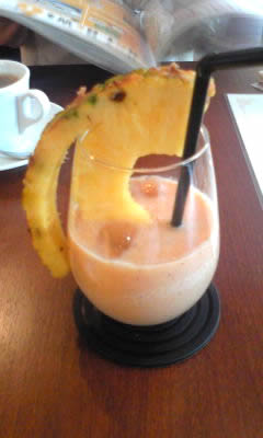 フルーツの盛り合わせという超魅力的なメニューもあるのですが、今回はスタンダードにミックスジュースを頂くことにしました。因みに妻はさんざ迷った挙句に桃のカフェ。