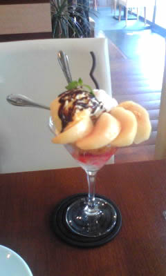 さて、運ばれてきたミックスジュースには、そのグラスのサイズに比してあまりに巨大なパインが一切れ付いてきました。何、このコントラスト・・・。写真だとグラスが小さいように見えるじゃないですか・・・。しかも、このパイン。非常にうまい。あまりにうまいので、瞬間的に魂は石垣島に飛んでいました。かの地のパインも非常にうまいのですが、ここのも甘くて歯ごたえもしゃっきりとしていてほんと美味しかったです。奥さんの桃のパフェは、ちらっと見ただけでは桃がずり落ちそうで心配になるのです。しかし、アイスクリームも含め、どれもフルーツ三昧で、これまた贅沢な逸品。やはりビタミンCはこの店で取るべきだな、しかし、果糖には気をつけなければ・・・などと思いをめぐらせながら車を発進させるのでした・・・。
