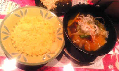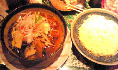 感涙にむせぶ父親をよそに、娘はやおらサフランライスを“ストレート”で食べ始めます。おーい、それは、スープに浸したりして食べるほうが美味しいんですよーーーと言ってみるが、ま、ぬかに釘です。ご本人、黄色いご飯がでてきたので、それをカレーと思ってしまったんでしょうか?もしそうだとしたら、この子の味覚、精密検査が必要ですな。だって、ぱくぱくと何口も食べておりましたから。しかし、ハンバーグが余裕で隠れるくらいの野菜・野菜・野菜。素晴らしいですねー。これは身体に良いんだろうな~などと思いながら自分のを待ちます。妻のが運ばれて来ました。(ビーフ)友人(夫)のが運ばれて来ました。(豚の角煮)友人(妻)のが運ばれて来ました。(チキン)なかなか来ません・・・ここのスープカレーをオーダーするには、1.チキンやビーフ、ハンバーグなどの主となるスープカレーを選ぶ。2.トッピング(これがまた大量にある)を選択する。3.辛さを選ぶ(覚醒、瞑想、悶絶、涅槃、極楽、天空、虚空まで7段階)の3段階が求められます。優柔不断な私としては、非常に厳しいと言えるでしょう。だから、今回は即断即決を心がけました。結果、1.チキン2.野菜、チーズ3.涅槃(7段階のうちの4番目の辛さ)だったんですが、トッピングはともかく、辛さを増すと時間がかかるようで、一番後にやってきたんです。