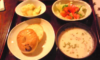 元が小さなお寺ですから、路地を入ったところにひっそりとあります。で、中に入ると最近の私が非常にタイプとしている和なカフェが表れるのです。靴を脱いで座敷に上がると軽やかなカフェミュージックが流れてます。畳にあぐらをかき、ぐるっと見回してもお寺っぽさはあんまりありません。ただひたすら気持ちの良い、きれいな空間です。もっと、お寺お寺してるところかと思いましたので、かえって緊張が和みました。なんでもお寺そのものは春日井(?)の方に移転したそうで、ご本尊のあったところが今は板間になってます。で、お食事。私は新幹線の中でも我慢してカフェごはんを楽しみにしてきたんです!でも、でも、ランチぎりぎりの時間だったため、ご飯もの終了とのこと(T_T)で、あったのがこれなんと、べーグル!スープ、サラダ、マッシュポテトの小鉢が御膳に乗ってきます………。