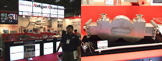 (株)東京チタニウム様チタン加工ならお任せ。高度なチタン溶接技術をPRするため、あえて自動車の排気系(センターパイプ宇~テールピース)をデモ製作し展示しています。右写真はチタン熱交換機。珍しいマグネシウム溶接見本もありました。