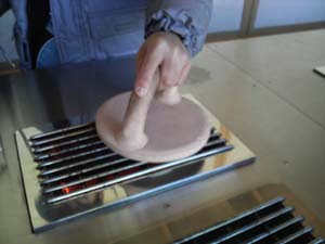 さらに焼いていくと、生地が反ってきますので、押瓦を使って上から押し反りを直していきます。