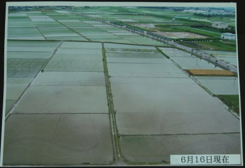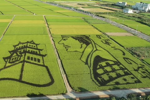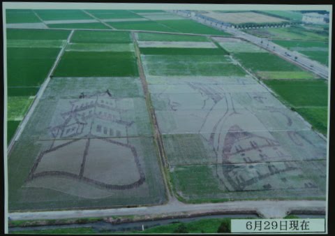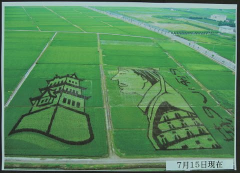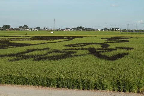 これは行田市と農家や農協が中心となって、米や観光PRを目的に一昨年から始めたもので、今年は、「のぼうの城」の映画化を記念し、関東最大級となる1万3千平方?の水田を確保して作成しもので、同小説の表紙イラストなどを表現している。