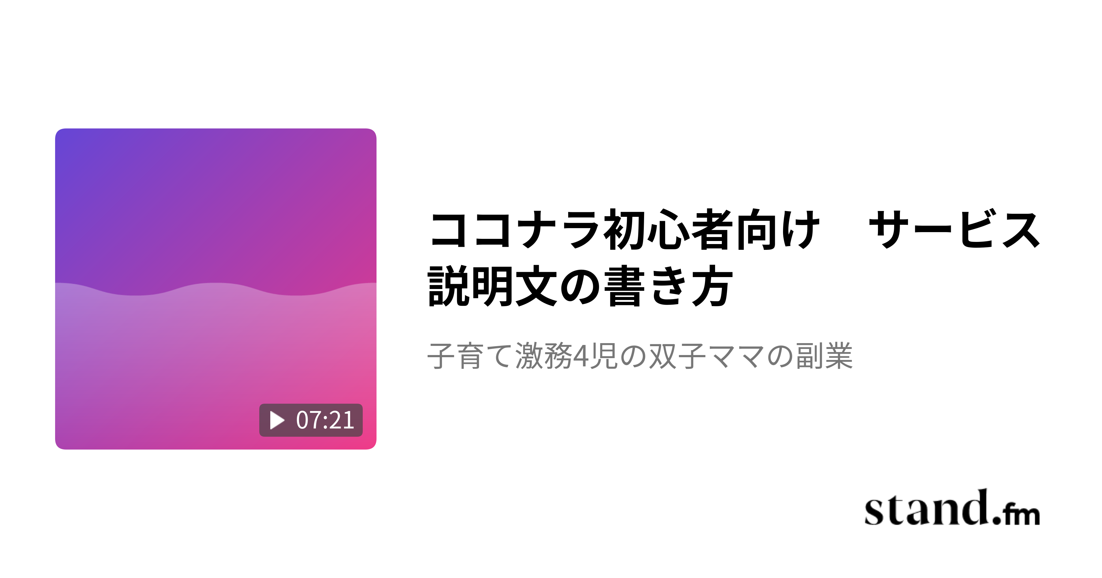 ココナラ初心者向け サービス説明文の書き方 - 子育て激務4児の双子ママの副業 | stand.fmココナラはコツさえ掴めば、副業初心者ママが稼ぎやすい場所ココナラ。 副業初心者ママ向けの稼げるサービス出品してまーす♪ ↓ 0→1出品サポート https://coconala.com/services/2685115 #ココナラ出品 #売れない #サポート #副業さがしてます #在宅ワーク #お小遣い #節約 …stand.fm