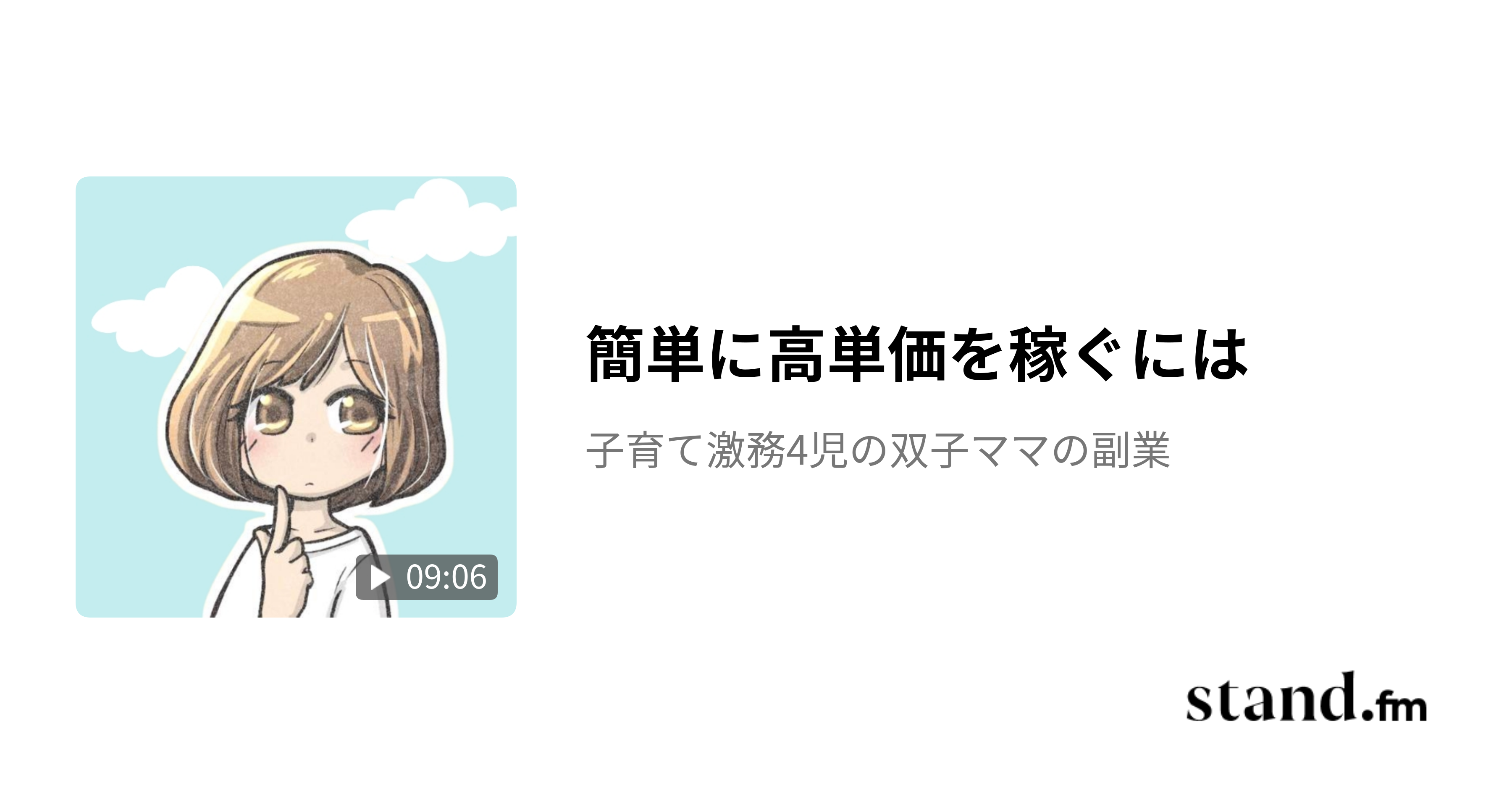 簡単に高単価を稼ぐには - 子育て激務4児の双子ママの副業 | stand.fmスキル0実績0でもクラウドワークスで月1万稼ぐ https://coconala.com/services/2752386 #ココナラ #副業 #子育て stand.fm