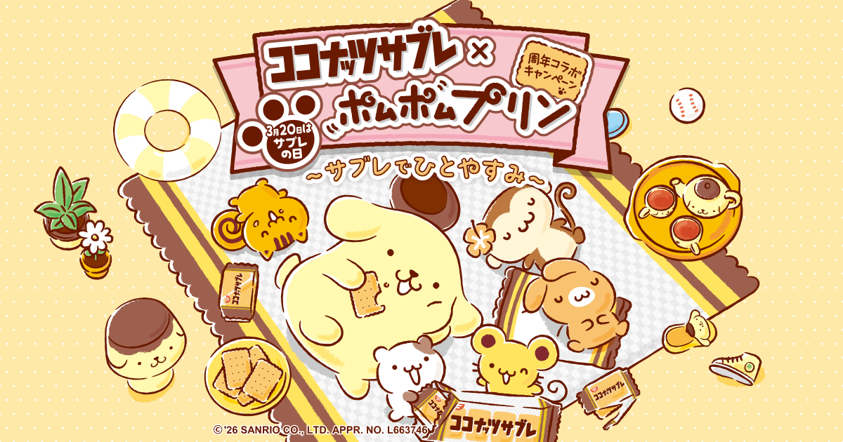 ココナッツサブレ|ココナッツサブレ×ポムポムプリン周年コラボキャンペーン ~サブレでひとやすみ~|日清シスコココナッツサブレ×ポムポムプリンのオリジナルイラスト入りグッズセットを抽選で320名様にプレゼント!対象商品2個以上購入のレシートで応募しよう!www.coconut-sable.jp