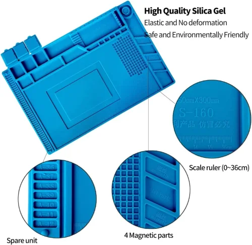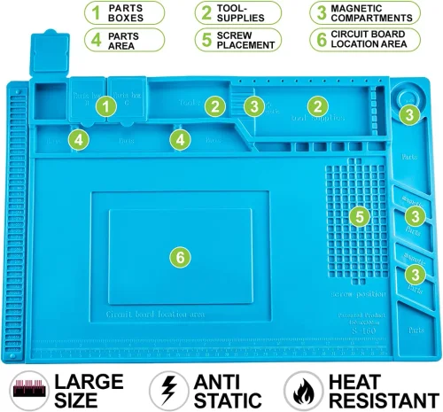実際にこの作業マットを使ってみると、その使いやすさに感動しました。まず、マット自体がシリコン製なので、ハンダゴテの熱にも強く、万が一触れてしまっても焦げ付く心配がありません。これまでは熱に弱い作業台に直接置いていたので、常にヒヤヒヤしていましたが、このマットがあれば安心して作業に集中できます。さらに、マット表面には細かい溝や仕切りがたくさんあり、ネジや小さな電子部品を置くのにぴったりなんです。散らかりがちな小物類が転がったり、どこかにいってしまったりする心配がなくなりました。これは本当に助かります。