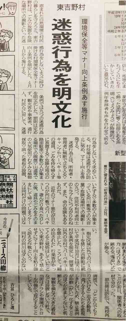本条例は、河川敷におけるバーベキュー等の利用者によるごみや道具類を放置する事例が多発し一般客や周辺住民への迷惑になっていることから、その対策として迷惑行為を禁止、規制するものではなく、迷惑行為を規定し、すべての村民が健康かつ快適な生活を営み、誰もが 気持ちよく過ごすことができる場所であるために、ごみや道具類の持ち帰りを訴えるなどマナー の向上を呼びかけることで意識啓発を図ることとしています。