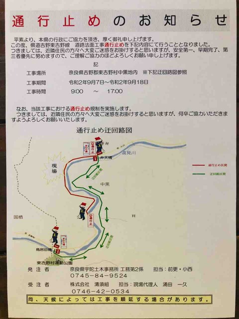 通行止のお知らせ : 東吉野…おおまる仁志県道、吉野東吉野線の吉野郡東吉野村中黒地内、道路法面工事の為、暫くの間、通行止めとなります。内容は…工事期間 令和2年9月7日〜9月18日工事時間 9:00〜17:00土曜日、日曜日は解除この期間は向側の村道まわり道となります。※工事の進み具合で期間以内に解除となる場合blog.livedoor.jp