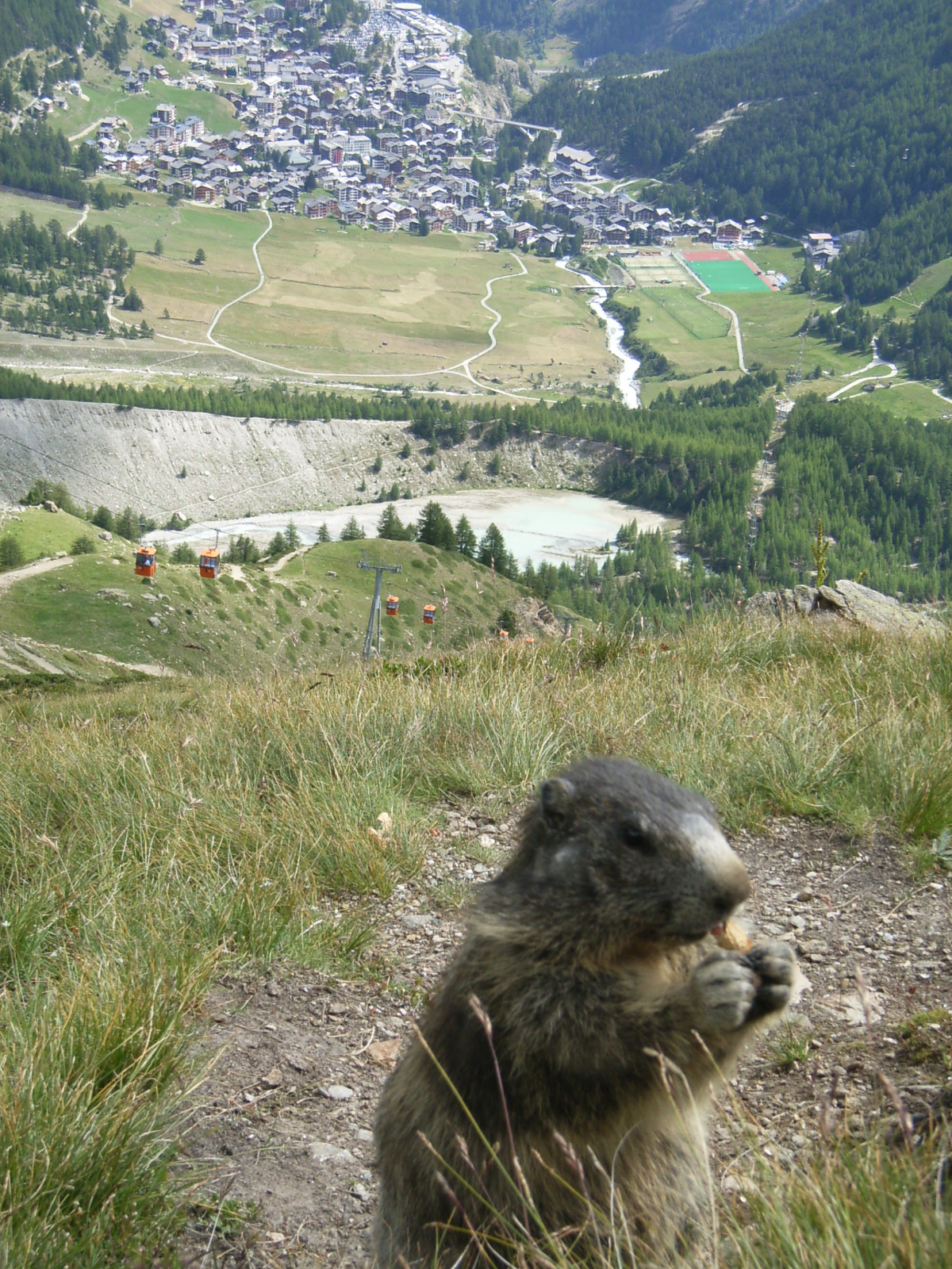 サースフェーには、マーモットがたくさんいて、そばまで寄ることができます。ピーナッツを差し出すと、ゆっくり寄ってきてくれますので、こんなアップも撮れてしまうというわけ。