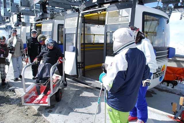 ロープウェーやゴンドラなどが、そこらじゅうにありますが、チェアスキーヤーもそのまま乗れるような工夫です。