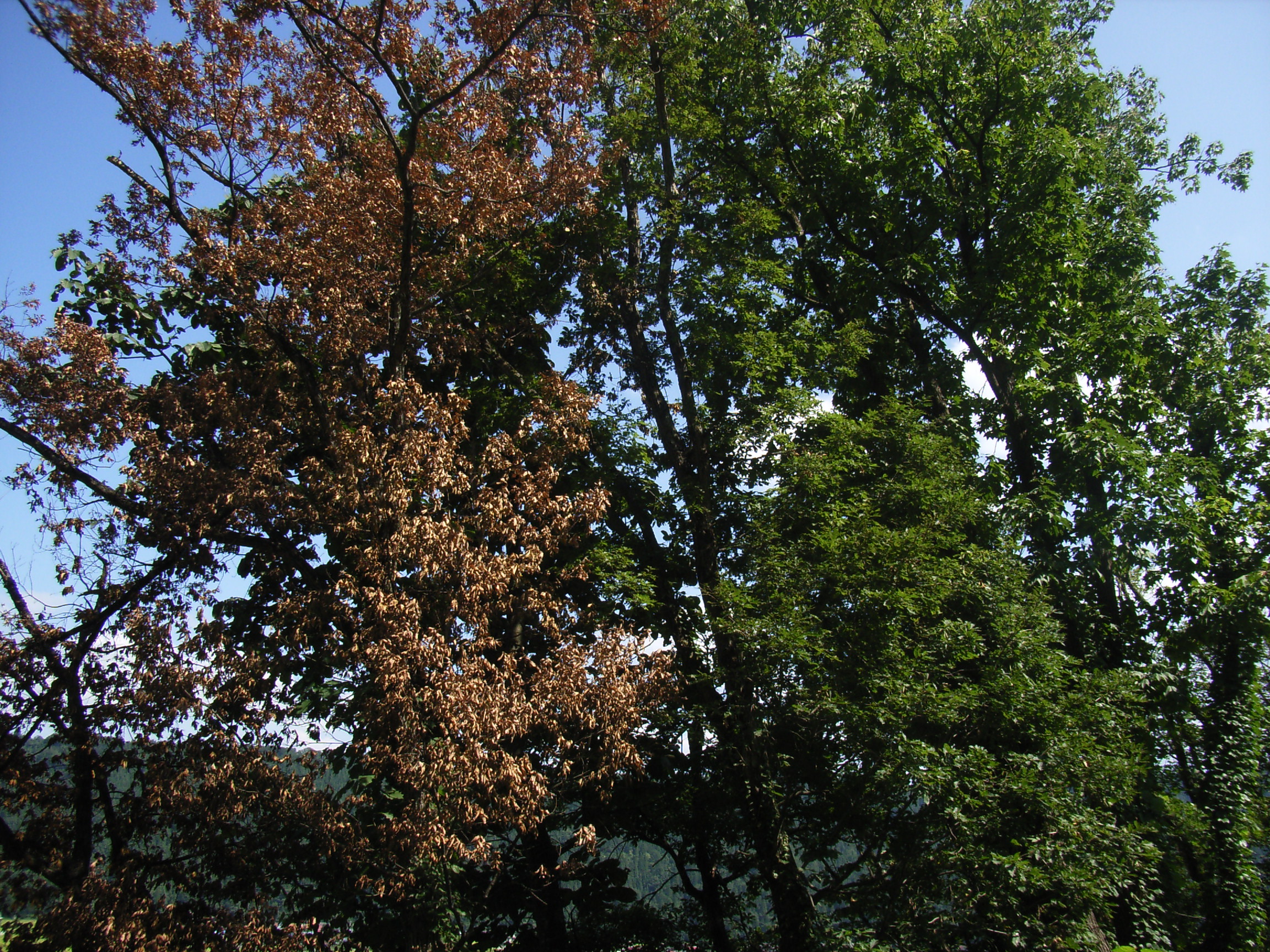 写真では、左の赤茶になっているのが、ナラ枯れにやられているもの。右の木も同じ木(ミズナラ)ですが、一目瞭然です。実は津南、秋山郷で、この被害が広がっています。