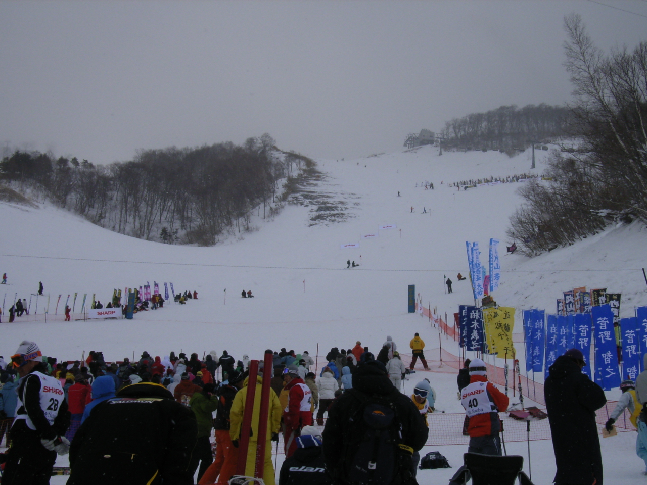 さて、今日は、CVと鈴木キャストの3名で苗場で開催されている大会「技術選」を見学に行ってきました。全国の予選を勝ち抜いたスキーの名手たちが、その技術の高さを競う大会で、スキーを仕事にしているものとしても、勉強が必要ということで見学です。