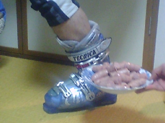 脚はカーバー、ウインナーは昨夜のビールのおつまみ(Kコーチ差し入れ)、ブーツはJKのものです。