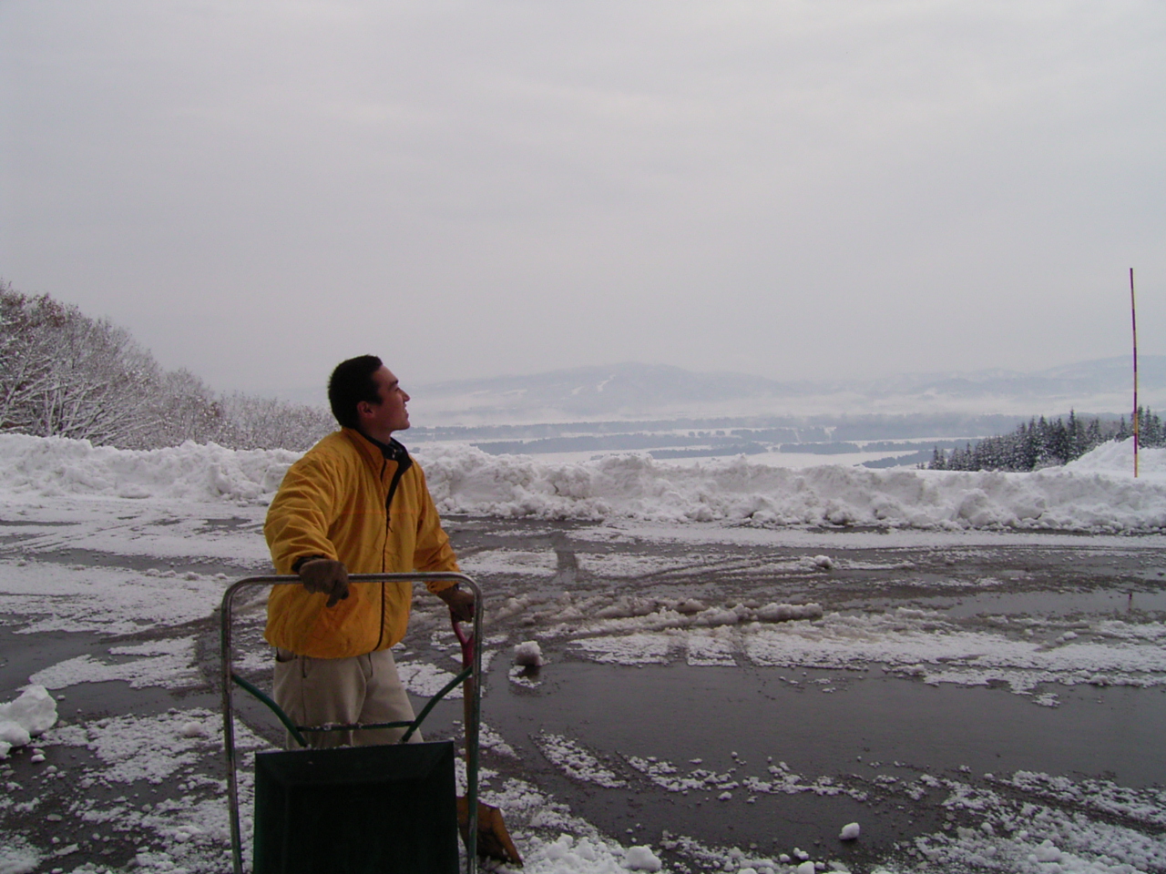 カガン部のディレクターN氏は、ゲレンデにある白樺の木にも電飾を取り付ける作業をしていました。いったんは取り付けたのですが、あまりに寂しいということで、まわりのみんなから「センスねえ!」などと厳しい叱咤を浴び、おそらく挽回の策を練っているころかと思います。