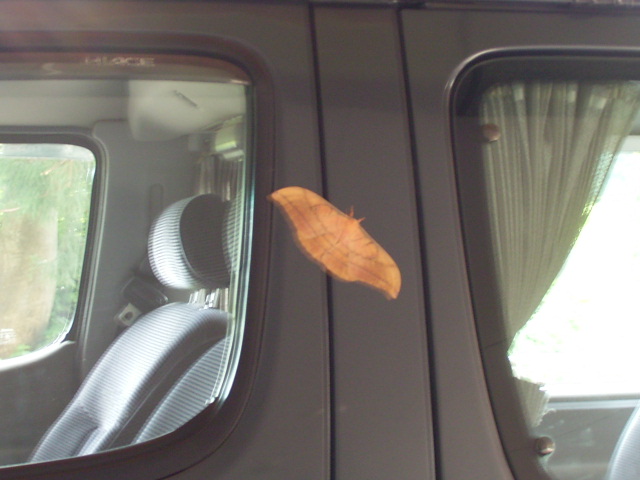 さて今朝、事務所に出勤してきたときに発見した「巨大蛾(モスラ)」です。わがファクスマ・ハイエースにビッタリとくっついているところを発見しました。いかに大きいか、おわかりいただけますでしょうか?どうして、こんなにでっかい蛾がいるのでしょうか?それになんなんでしょう?この模様は。非常に気持ち悪いです。