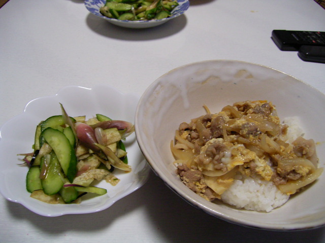 写真は、一昨日の男2名のメニュー。豚丼(私の担当)&きゅうり、みょうが、なすのあえもの(カーバー担当)です。一応、ちゃんと自炊してるんですよー。