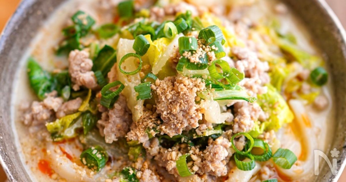 【ごま味噌豆乳担々うどん】担々麺風☆ピリ辛スープが絶品♪ | レシピサイトNadia【スープが絶品🥢✨おうちで簡単♪担々麺風ピリ辛スープのぽかぽかうどん🍜】ひき肉と白菜をにんにくと豆板醤で香り高く炒めたらスープを入れて3分ほど煮てすぐできるおうどんです(^^)❣️oceans-nadia.com