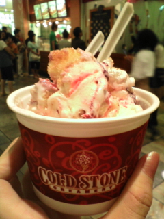 COLD STONE CREAMERY 今更ですが、 甘いものがさほど好きではない私も とうとうお味見(・∀・) ストロベリーショートケーキなんちゃら(笑) 思いのほか美味しかったです♪ でも照れ屋さんの私は、 満面の笑顔で急に歌い出す店員さんたちが やっぱりちょっと苦手かも(笑)