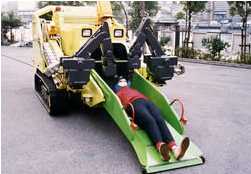 ロボット紹介 【救出ロボット:ロボキュー】救助訓練で要救助者を寝台へ収納中の救出ロボットこの救出ロボットは、最新式のマニピュレータ2本を活用して要救助者を収容する構造で、前方監視カメラ・濃煙内撮像装置・可燃性ガス測定装置等の各種センサーを装備し、操作制御装置からの遠隔操作により隊員に代わって救助活動を行います。【ロボキュー】