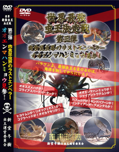 日記 【世界最強虫王決定戦第三弾】裏DVD鑑賞会!【ここクリック!】Windows Media Video視聴期限:無期限サイズ:2049.67MB価格:3980円(税込)格闘技:昆虫視聴期間:無制限収録時間:170分画質:高画質(2M)出場選虫:バヌアツオオムカデ、デスストーカー スコーピオン、ヒヨケムシ、オオカマキリ、スズメバチ、ジャイアントマレーシアカマキリ、タイランドブラック、ベトナムオオムカデ、アルキデスオオヒラタクワガタ短歯、パラワンオオヒラタクワガタ、スマトラオオヒラタクワガタ、シャイニーバロー、オオエンマハンミュウ、ジャイアントデスストーカー、キングバブーン、ハブムカデ、ゴライアスバードイーター、インデアンオーナメンタル、デザートヘアリー、ジャイアントオレンジデスストーカー、ハラビロカマキリ、ビルマブラウン