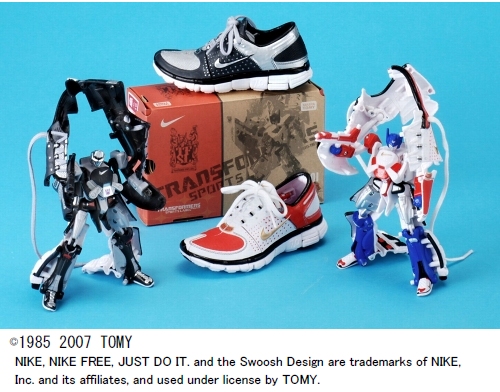 ロボット紹介 【NIKE FREE 7.0】【PC公式】でも未だ載ってない「TRANSFORMERS SPORTS LABEL」(上段がCONVOY feat. NIKE FREE 7.0」、下段が「MEGATRON feat. NIKE FREE 7.0」)今春発売のナイキの最新シューズ「NIKE FREE 7.0」がロボットに変形する。トランスフォーマーシリーズの正義の司令官「コンボイ」になる「CONVOY feat. NIKE FREE 7.0」と、悪の破壊大帝「メガトロン」になる「MEGATRON feat. NIKE FREE 7.0」がある。シューズ形態は、ナイキが完全監修してNIKE FREE 7.0の細部まで再現した。11段階のステップでトランスフォームする。サイズは27センチの2分の1スケールで、幅60×高さ65×奥行き150mm、重さ約96g。久々のロボットネタ!とうとう靴がロボットに!ロボット熱が冷めていたがこれをきっかけに盛り上がらねば!