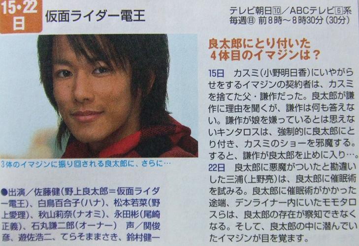 仮面ライダー電王 【リュウタロスは既に!!!】ネタバレ15日 カスミに嫌がらせをするイマジンの契約者は、カスミを捨てた父・謙作だった。良太郎が謙作に理由を聞くが謙作は何も答えない。謙作が娘を嫌っていると思えないキンタロスは、強制的に良太郎にとりつき、カスミのショーを邪魔する。すると、謙作が良太郎を止めに入り・・・・。22日 良太郎に悪魔がとりついたと勘違いした三浦(上野亮)は、良太郎に催眠術を試みる。良太郎に催眠術がかかったとたん、デンライナー内にいたモモタロスらは、良太郎の存在が察知できなくなる。そして、良太郎の中に潜んでいたイマジンが目を覚ます。そういえば空手野郎をイマジンにとりつかれていない状態で投げ飛ばしたりという前振りがいくつかあったような!リュウタロスは既にとりついていた訳かぁ。仮面ライダー電王 【2007/04/15 第12話「走れタロス!」】