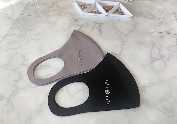 マスク2枚(当校用意)に、Hotfix(ホットフィックス)という布デコ用のスワロフスキーを使用する新しいレッスン。