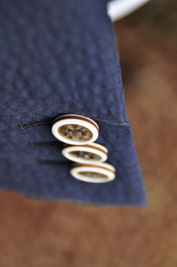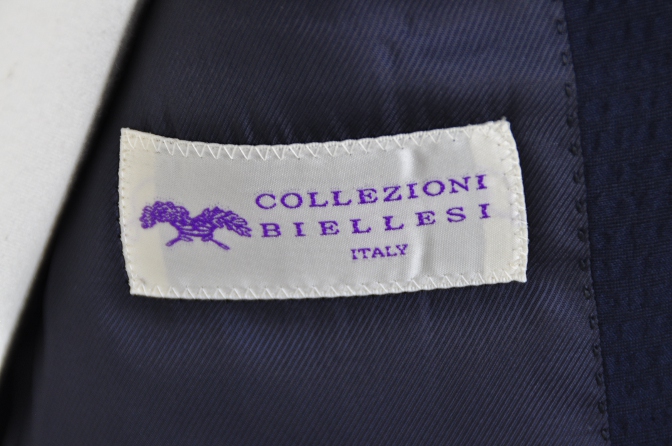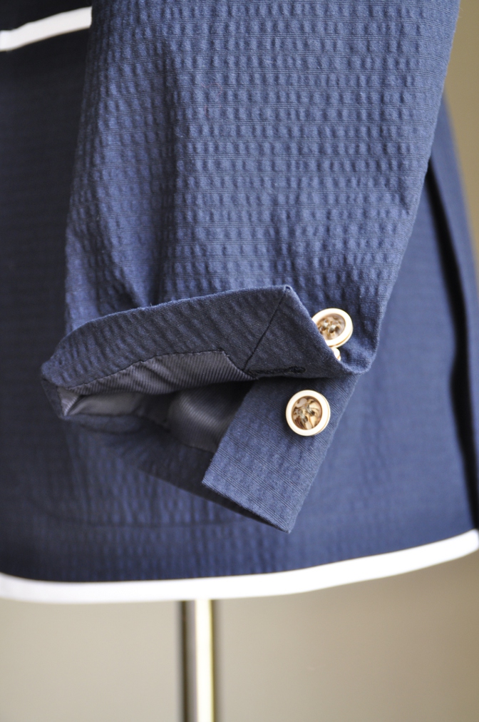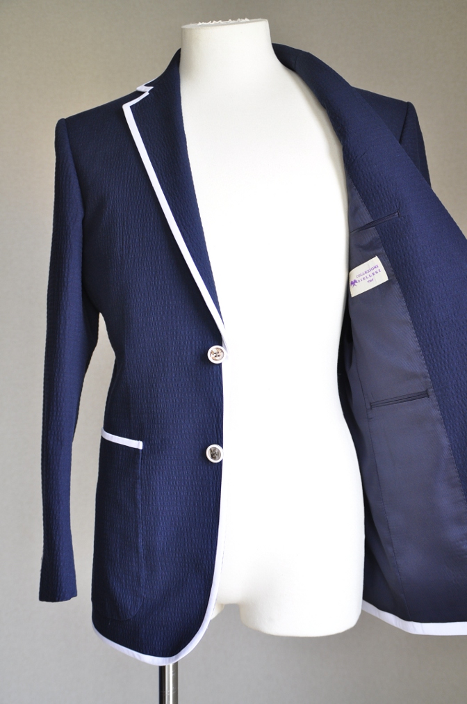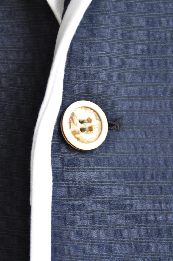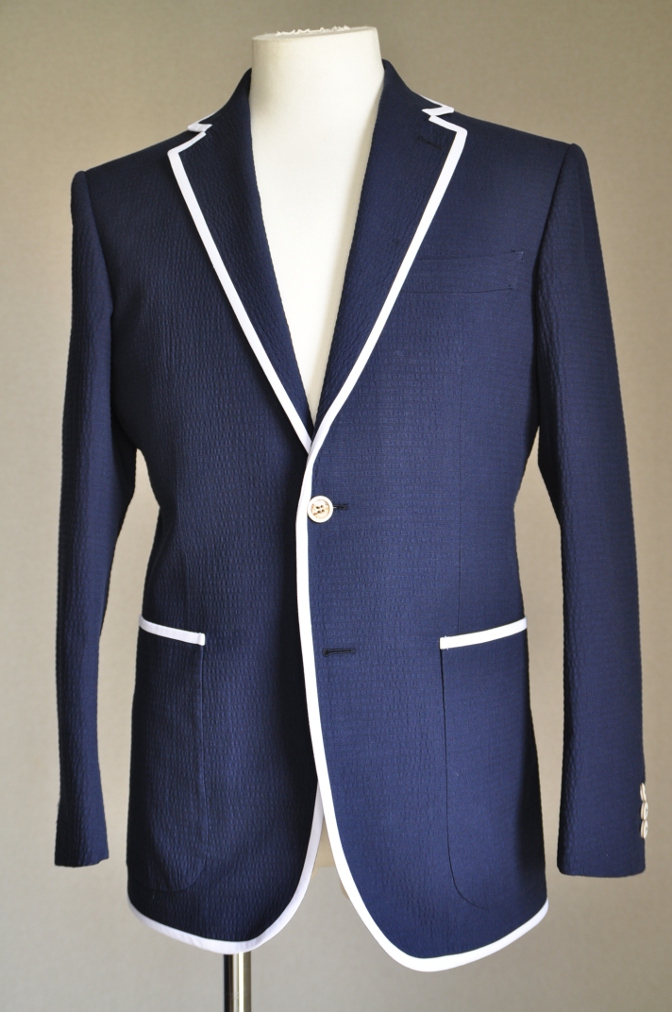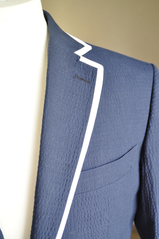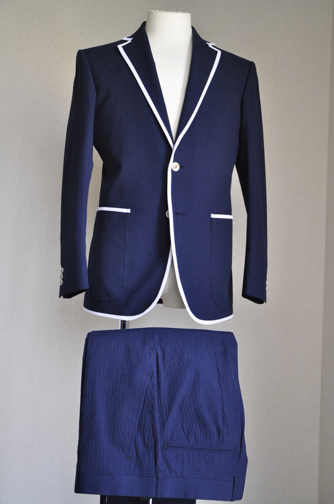 お客様のスーツの紹介-BIELLESI ネイビーシアサッカー 白パイピンング-