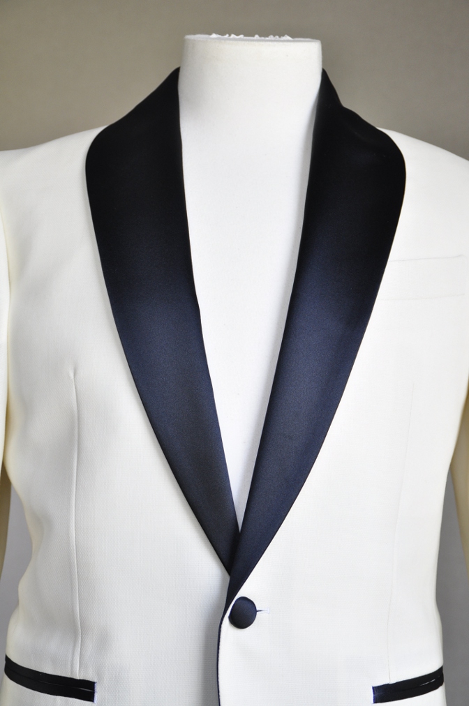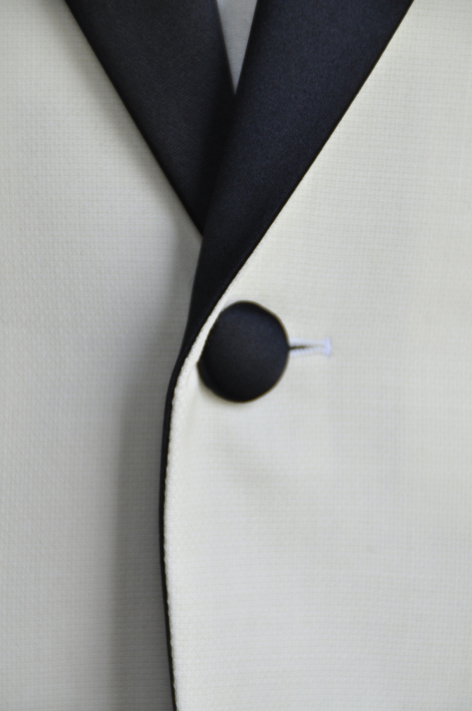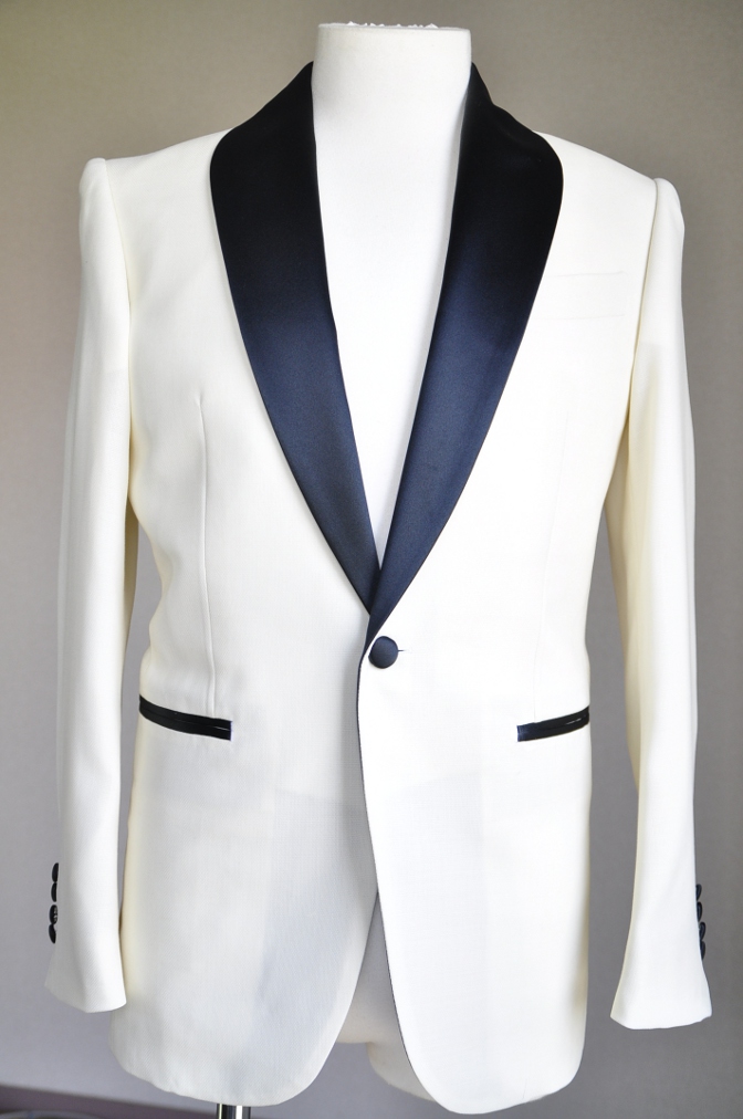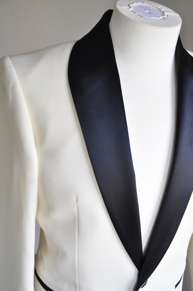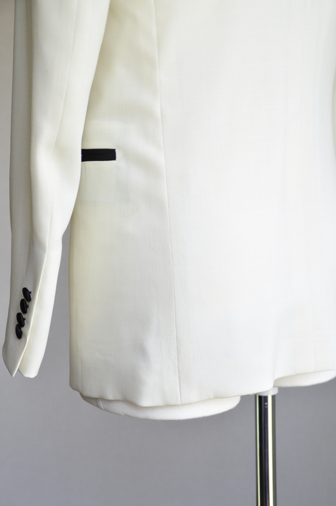 ホワイトの生地でショールカラーにてご自身の結婚式の二次会用にとご注文いただきました。